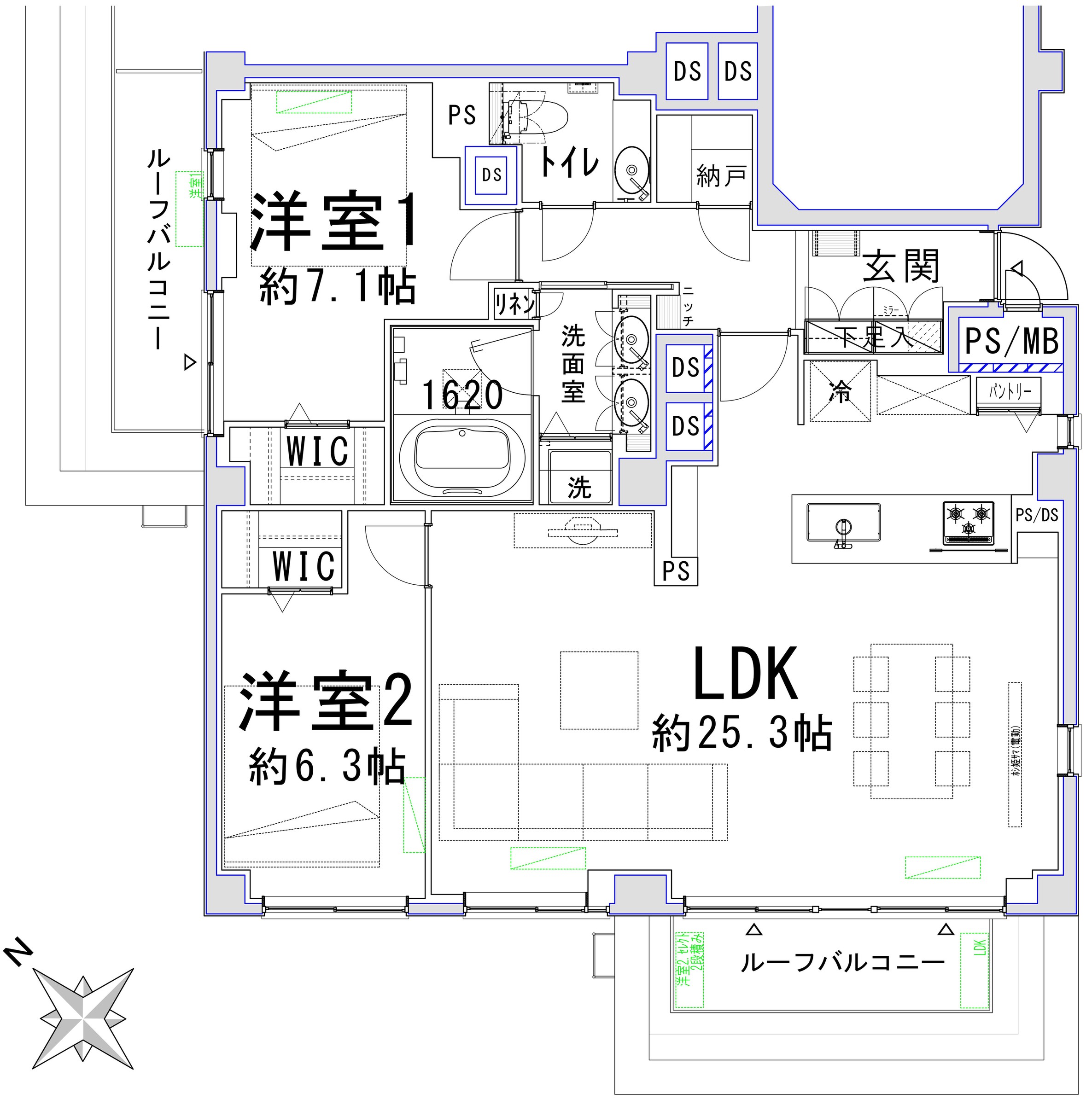 この住まいの最大の魅力は、約25.3帖という広々としたリビング・ダイニング・キッチンです。南西向きの窓からは柔らかな陽光が注ぎ込み、角住戸という配置が二方向からの採光と通風を可能にし、一日を通して快適な居住環境を実現しています。居室は約7.1帖と約6.3帖の2つの洋室を備えており、それぞれにウォークインクローゼットが設けられています。間取りは2LDKですが、3LDKへの変更も可能で、ライフスタイルの変化に柔軟に対応できます。
