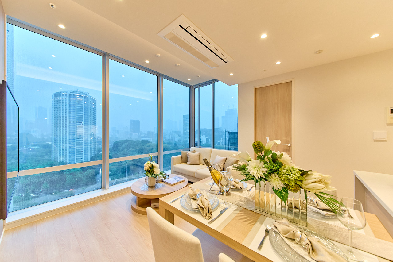 15階の高さから望む景色は、芝公園の豊かな緑や歴史ある慶應義塾大学のキャンパス、そして都心のスカイラインが調和した、他では得られない特別な眺望です。