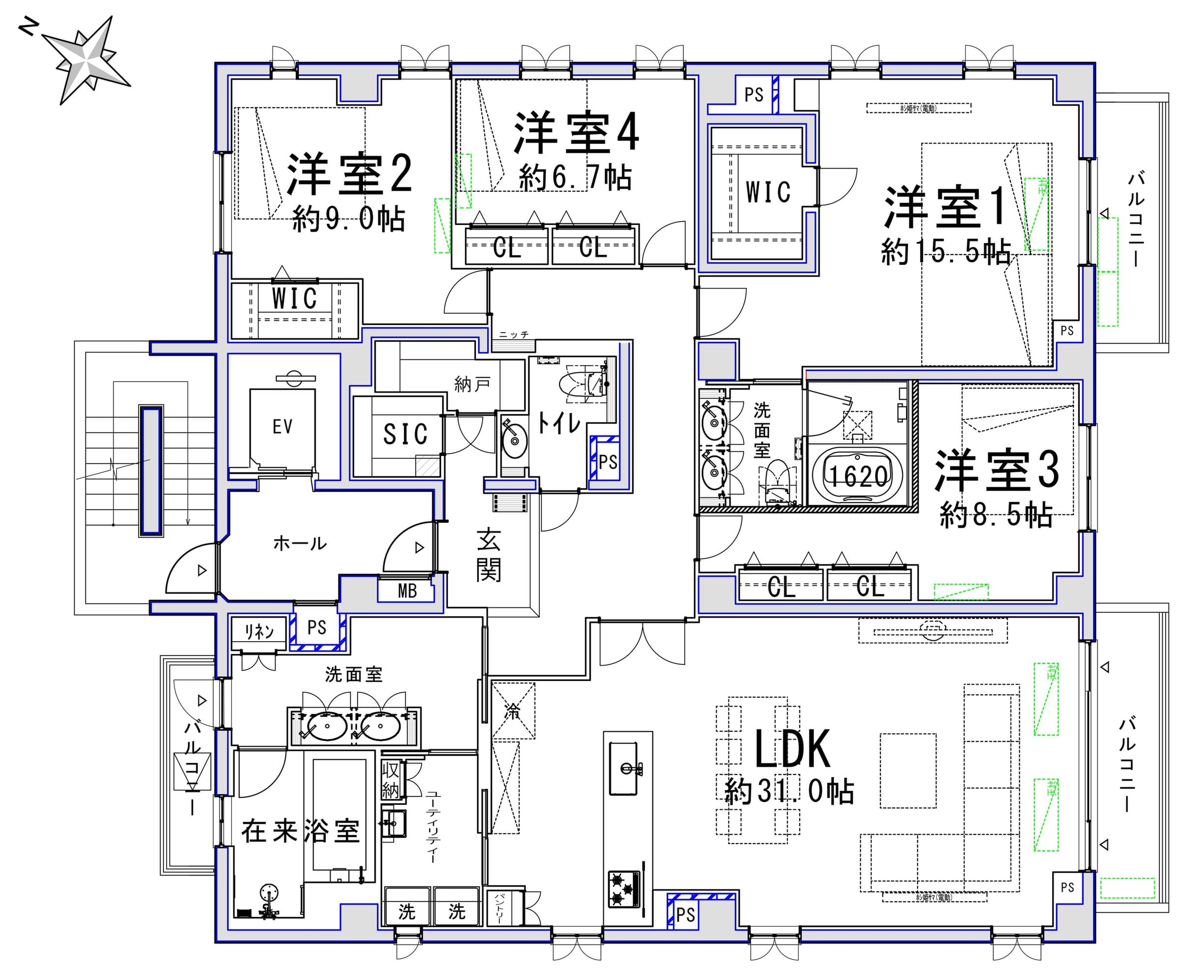4つの洋室はそれぞれに個性があります。ウォークインクローゼット付きの約15.5帖の主寝室は、南東と北東向きの朝陽が注ぐ2面採光で、陽当たりと風通しが心地よく、洗面室とバスルーム、トイレが直結した生活動線の良さも魅力です。約9帖のもうひとつのウォークインクローゼット付き洋室は、北西と北東向きの穏やかな採光で過ごしやすい空間となっています。クローゼット付きの約8.5帖と約6.7帖の洋室も、それぞれに十分な収納を備え、お子様の部屋や書斎、ワークスペースとして柔軟に活用できます。