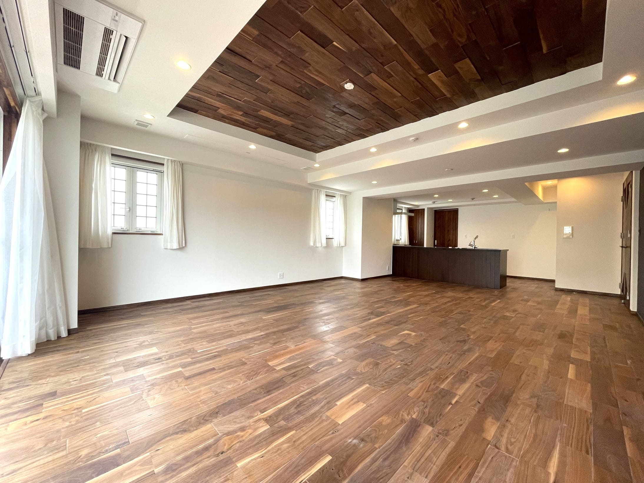 室内に足を踏み入れると、天然無垢のウォルナット材をふんだんに使用したフローリングと建具が、重厚感あるダークブラウンの美しい木目で迎えてくれます。約31帖の広々としたリビングダイニングキッチンは、南東と南西向きの2面採光により、陽光がたっぷりと注ぎ込み、開放感と暖かみに満ちた空間です。家族がゆったりと寛げる居心地の良さは、この住まいの大きな魅力といえます。