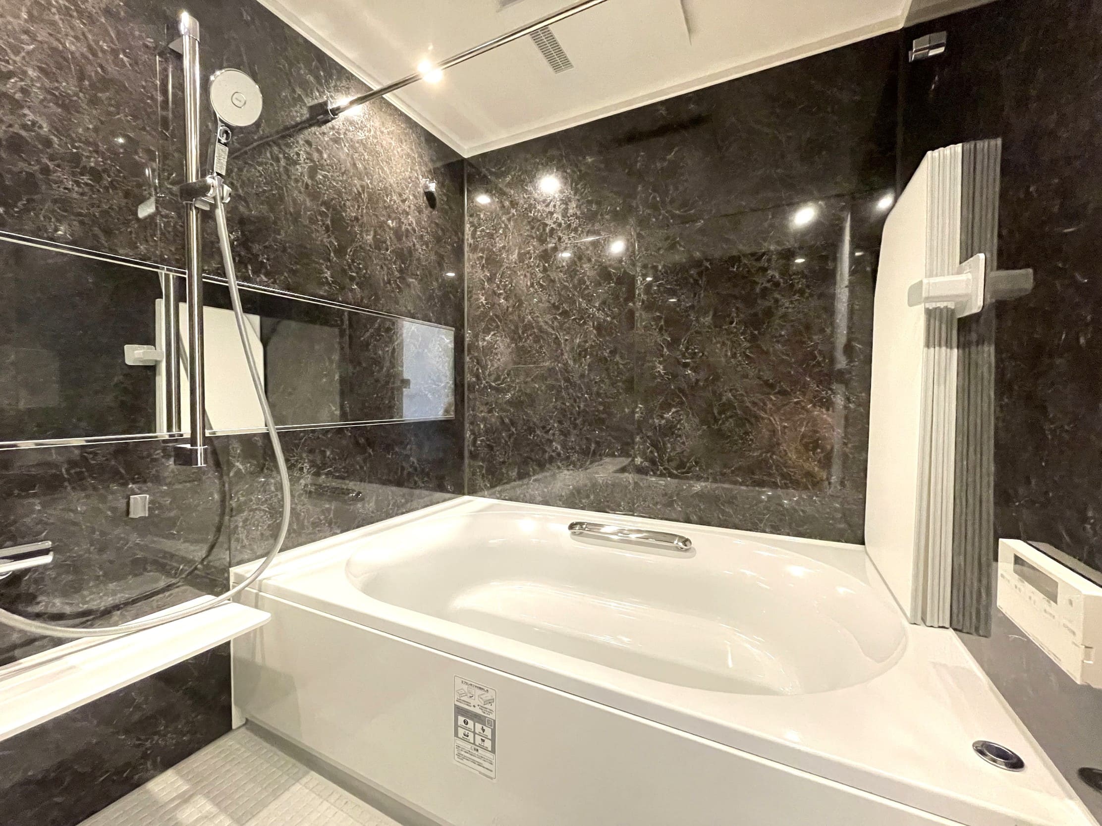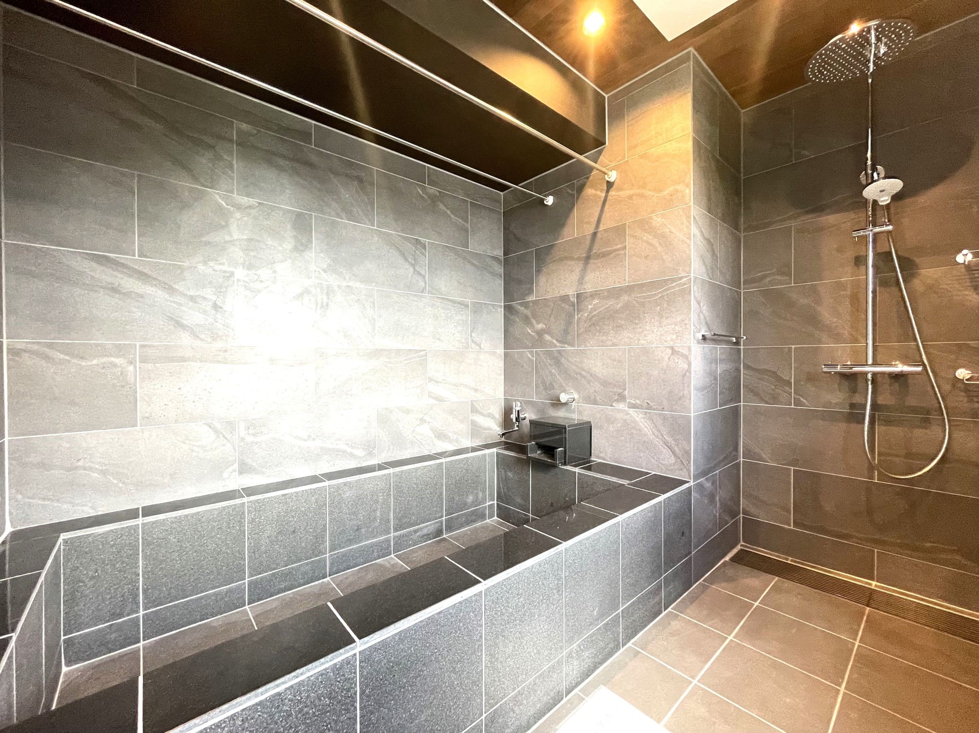 水回りの充実ぶりも特筆すべき点です。ツインボウルの洗面台が2箇所、大型の浴室が2箇所、トイレも2箇所と、家族が多い世帯や来客時にもストレスなく利用できる設計です。在来浴室は高級感があり、オーバーヘッドシャワーや大判のシャワーヘッドを備え、浴室換気乾燥機付きでバスタイムが快適なリラックス空間となっています。