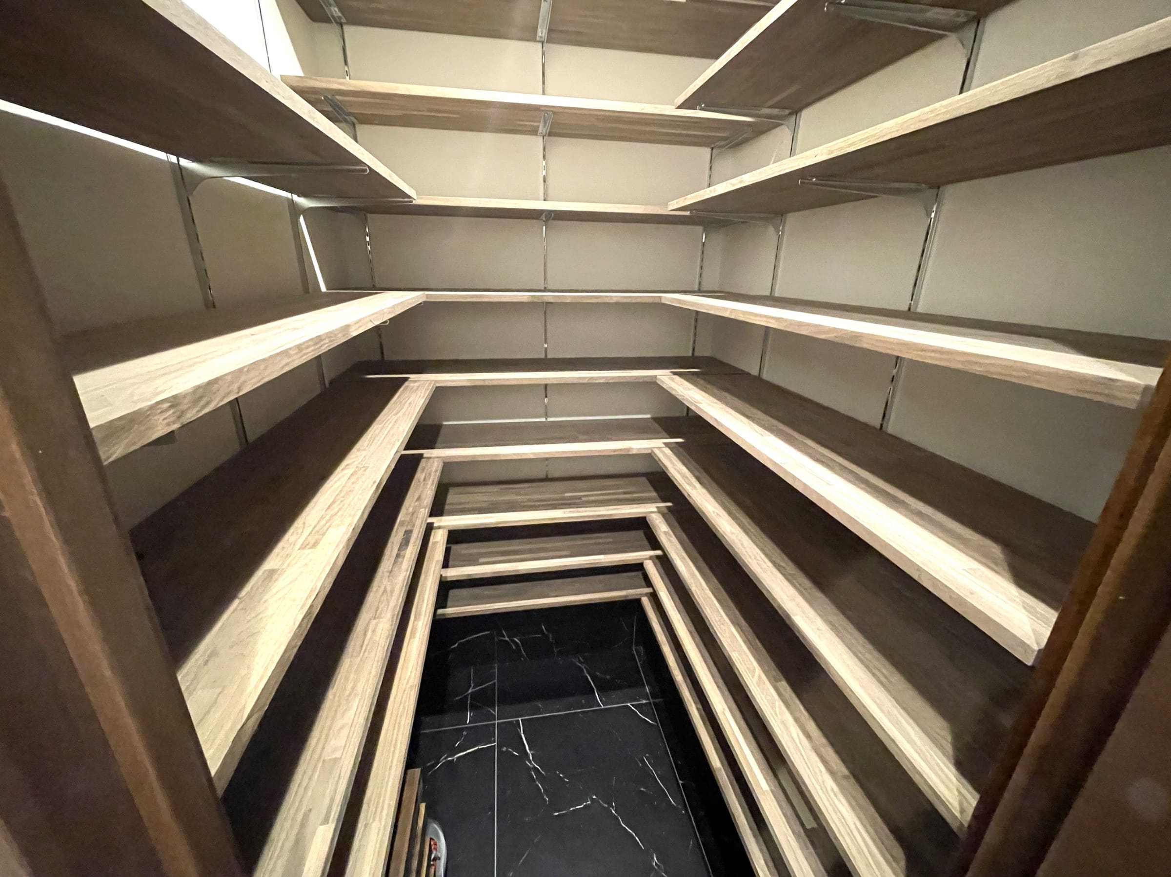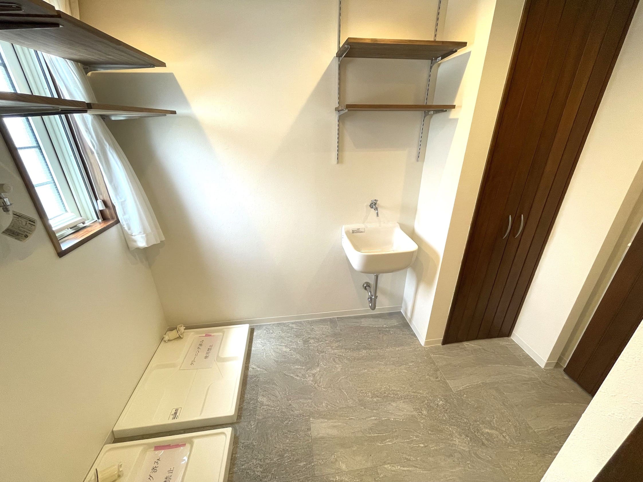 スロップシンク付きのユーティリティルームには2つの防水パンが設置され、洗濯機と乾燥機を別々に置くことも可能です。可動棚も豊富で、日用品のストックスペースとしても重宝します。