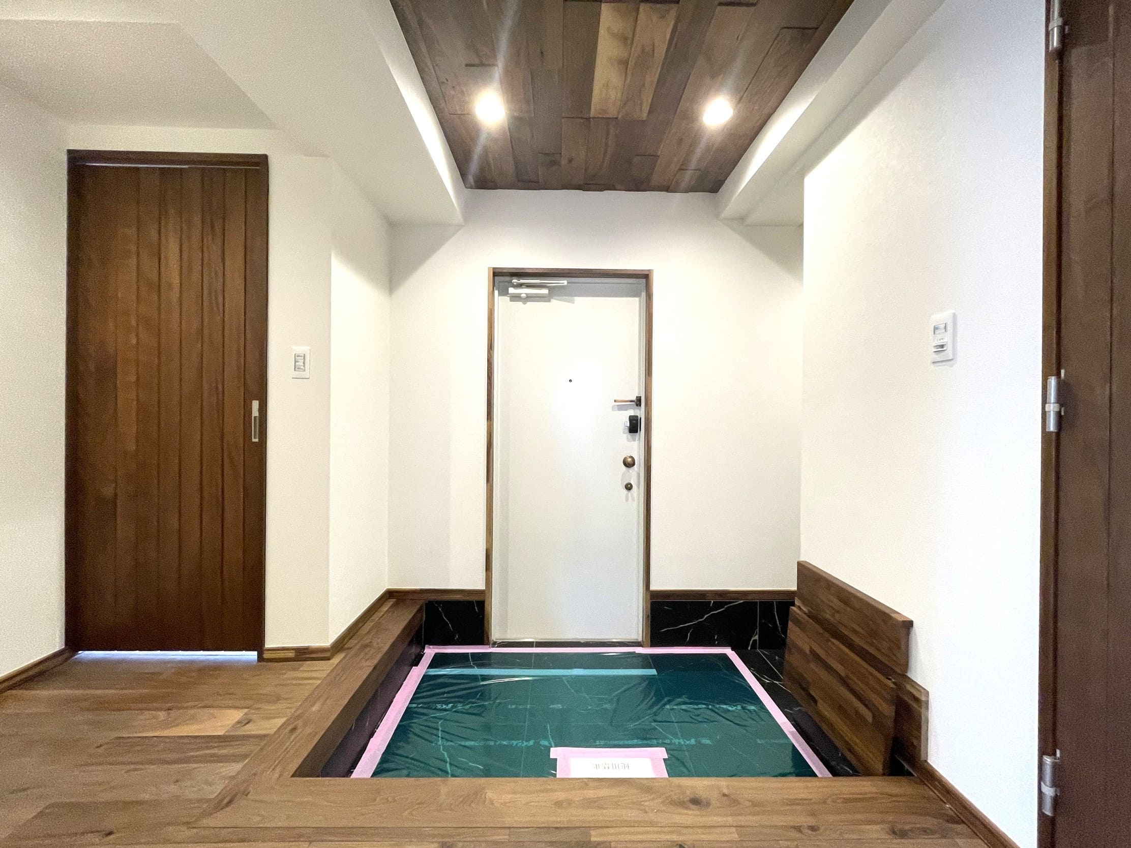 玄関は広めに設計され、天井やフローリングに天然無垢材を使用し、ブラックの石調タイル敷で上品な雰囲気を演出しています。玄関横の大容量シューズインクローゼットは、靴の高さに合わせて調節できる天然木の可動棚が設置され、傘立ても備えています。さらに納戸も用意されており、ベビーカーやゴルフバッグなどの大型の荷物も収納でき、玄関フロアをすっきりと保てます。
